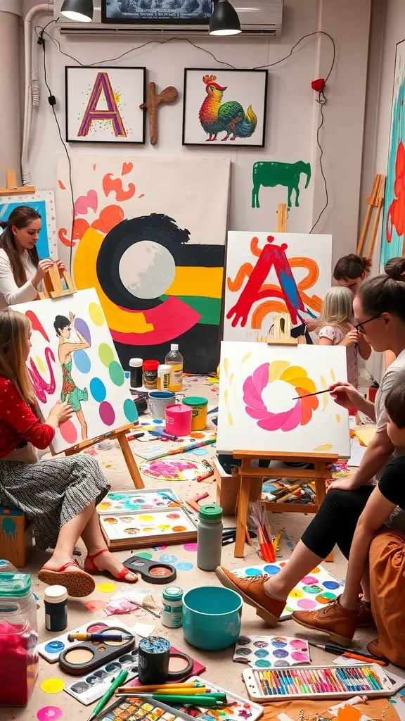 Hosting a creative art and craft party is a fantastic way to celebrate a 16th birthday. Imagine a space filled with vibrant colors and the sound of laughter as friends come together to express their artistic sides. The image shows a lively studio where everyone is engaged in painting, surrounded by a delightful mess of paint and supplies.