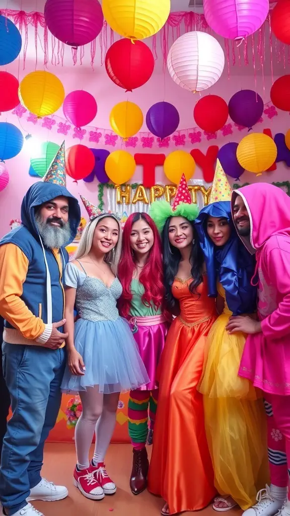 A themed costume party is a fantastic way to celebrate an 18th birthday. It allows everyone to express their creativity and have fun dressing up. The image shows a vibrant gathering filled with colorful decorations and excited guests in various costumes.