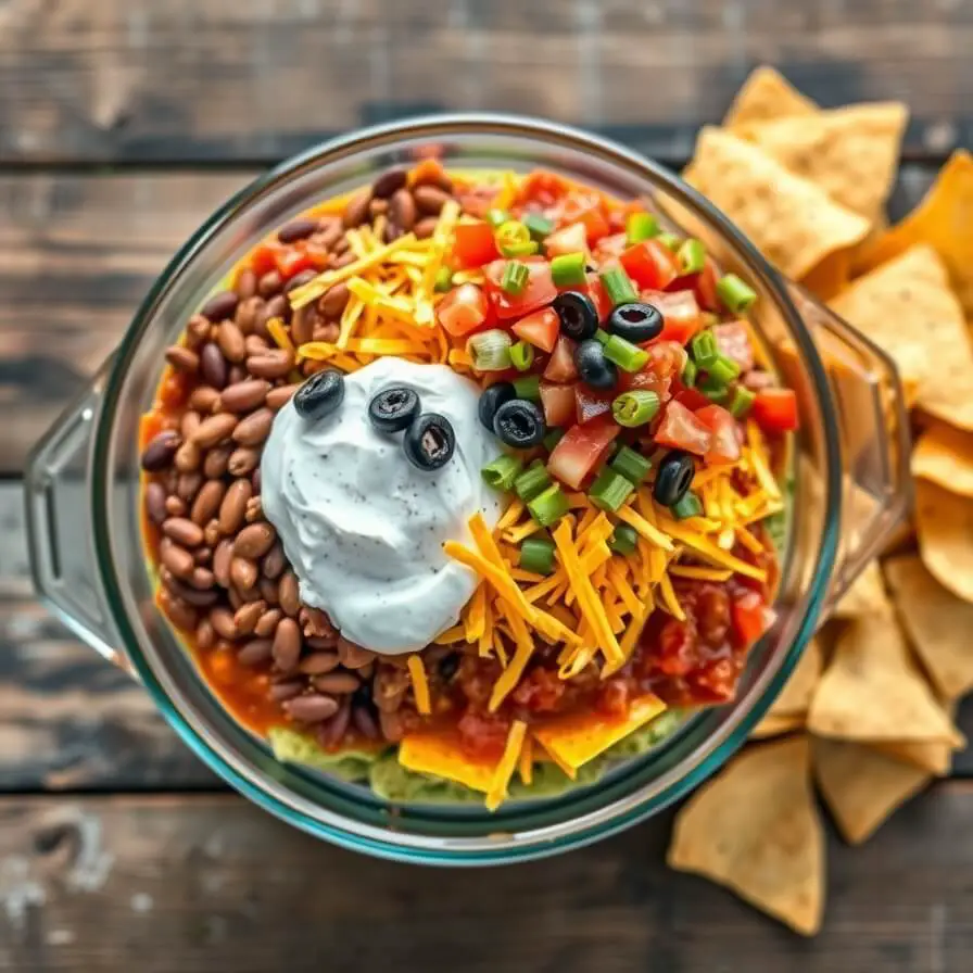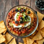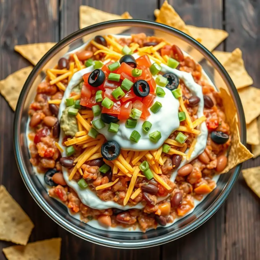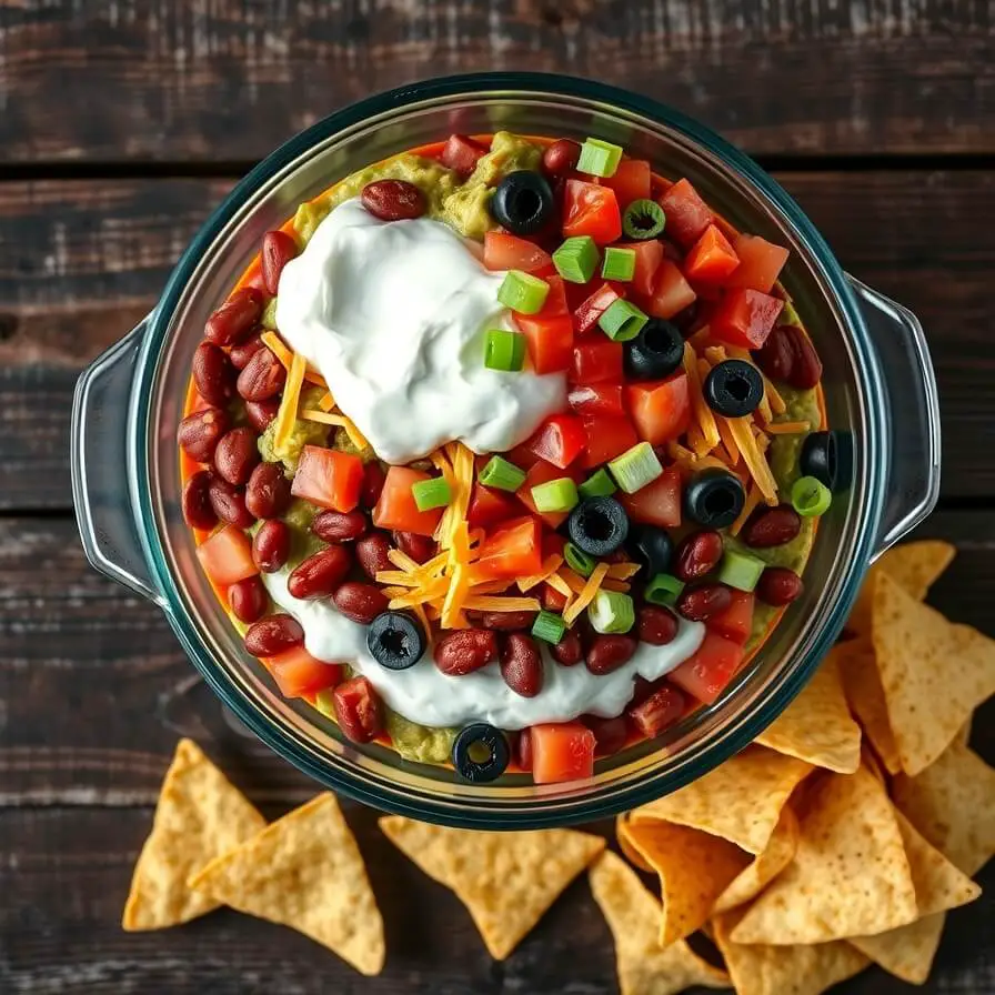 A colorful, crowd-pleasing dip layered with refried beans, guacamole, seasoned sour cream, salsa, cheese, olives, and fresh toppings. Perfect for parties, potlucks, or game day snacking. Every bite gives you creamy, crunchy, spicy, and tangy all in one scoop.