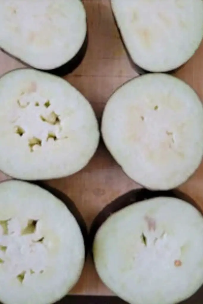 - Salt and rest the eggplant slices – This step draws out moisture and prevents the slices from becoming soggy. It also mellows any bitterness.