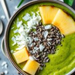 This smoothie bowl is a delightful mix of spinach and pineapple, creating a vibrant green base that’s both refreshing and nutritious. The bright colors of the toppings make it visually appealing and inviting.