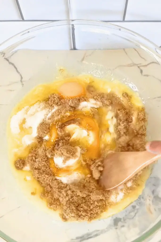 Mix in ¾ cup brown sugar, one beaten egg, and 1 teaspoon vanilla extract. The batter should look silky, not overly thick.