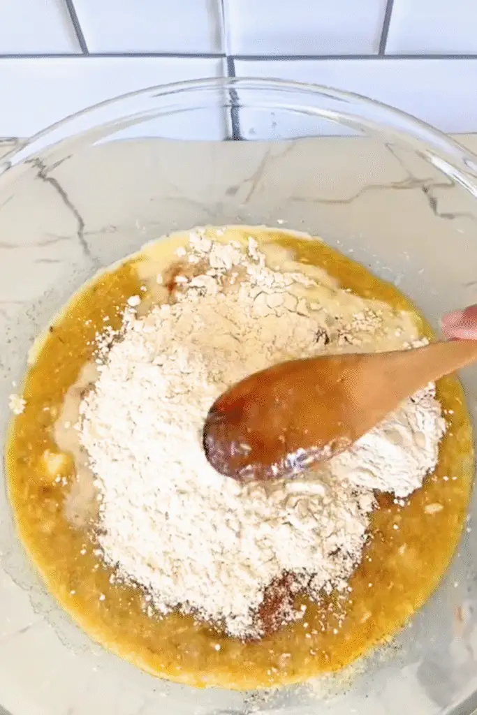 - Add dry ingredients to banana mixture and stir gently until just combined.