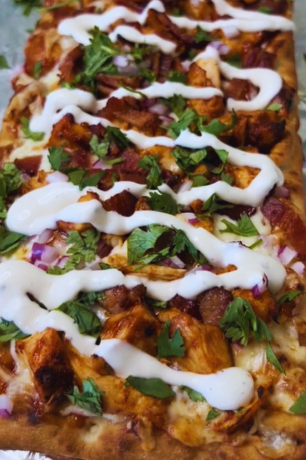 - Spread a thin layer of BBQ sauce, add chicken, then sprinkle cheese and toppings.