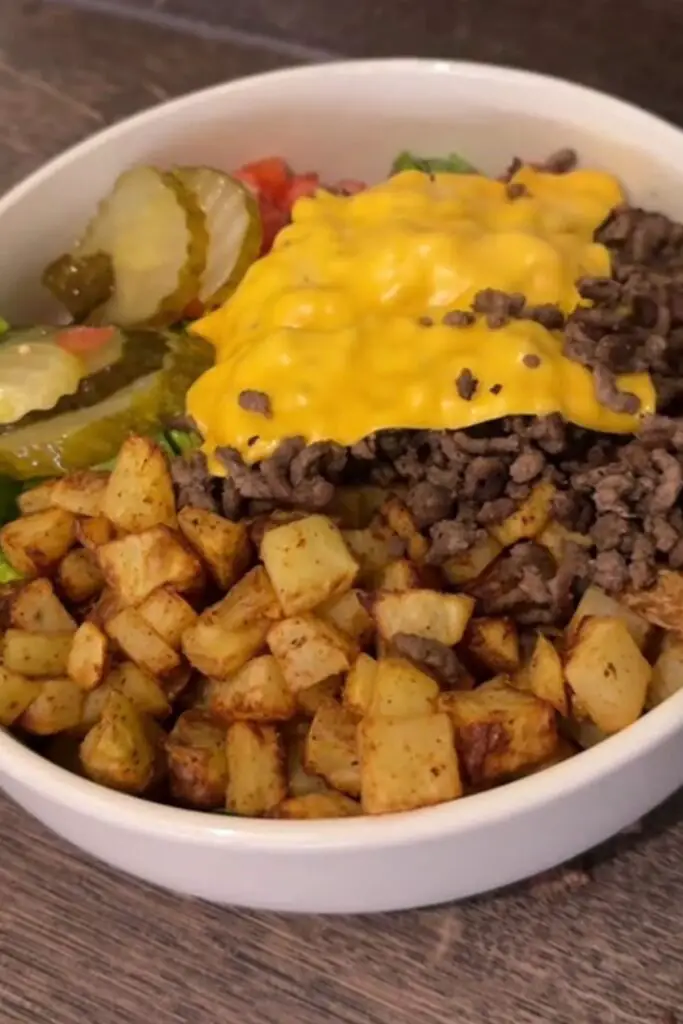 Not quite. Think of it as the best parts of a burger deconstructed: beef (or your protein of choice), fresh veggies, cheese, pickles, and sauce. It’s heartier than a salad but lighter than a full bun-and-fries plate.