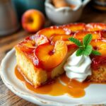 There’s something about serving a peach upside-down cake straight from the pan that feels rustic and celebratory. I like to let the cake cool just enough that the caramel glaze thickens slightly but is still warm—this way, each slice drips a little of that syrupy goodness onto the plate.