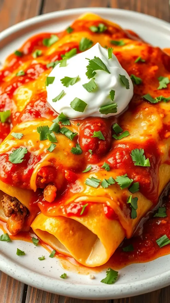 Cooking these enchiladas is straightforward. Brown the ground beef in a skillet, then mix in the enchilada sauce. Fill each tortilla with the beef mixture, roll them up, and place them in a baking dish. Top with cheese and bake until bubbly. Serve with a dollop of sour cream and a sprinkle of cilantro for added freshness.