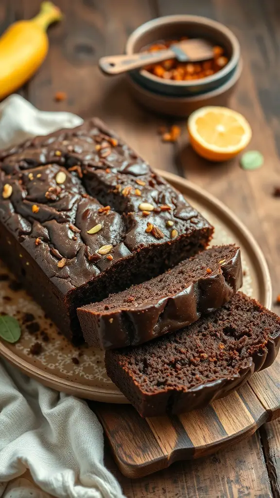 Chocolate banana bread is a delightful treat that can brighten any special occasion. The image shows a beautifully baked loaf topped with banana slices and a rich chocolate glaze. The warm colors and festive decorations around it create a cozy atmosphere, perfect for gatherings.