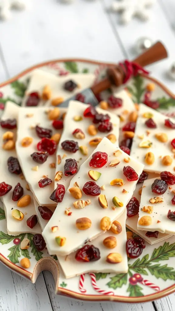 This delightful treat combines creamy white chocolate with the tartness of cranberries and the crunch of pistachios. The vibrant colors make it a festive addition to any dessert table.