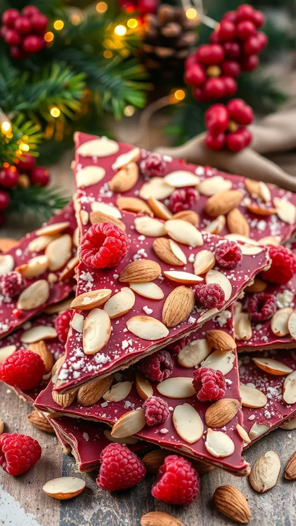 Raspberry almond bark is a festive treat that combines sweet and tart flavors. The vibrant red color from the raspberries makes it visually appealing, perfect for holiday gatherings.