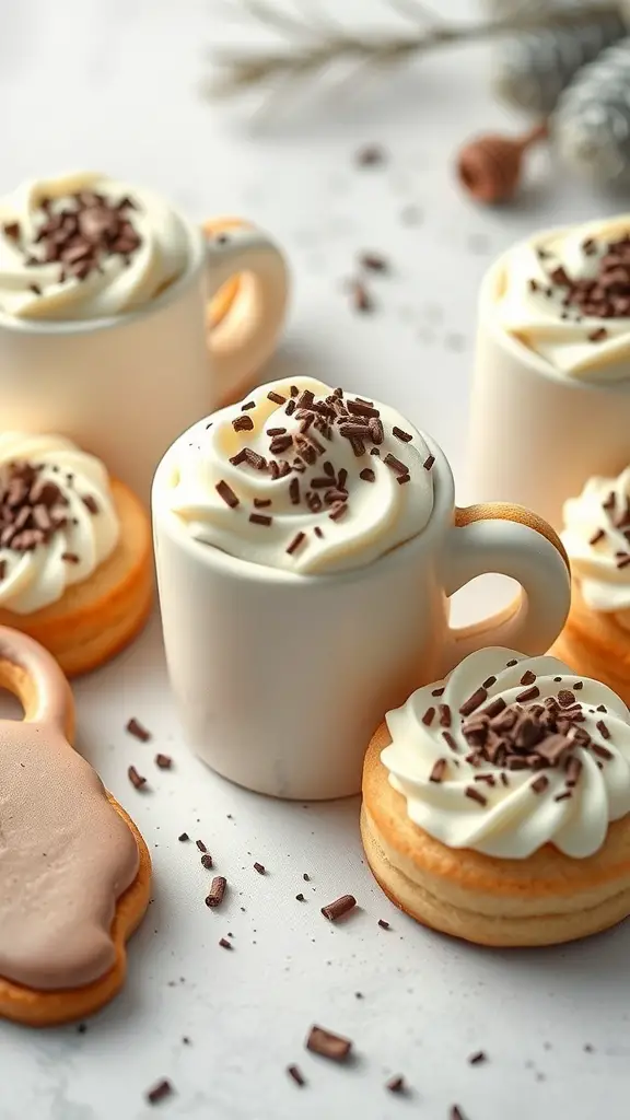 These cozy hot cocoa mug cookies are a delightful treat for the holiday season. Each cookie is shaped like a cute mug filled with whipped cream and topped with chocolate sprinkles. They look so inviting and perfect for a chilly day.