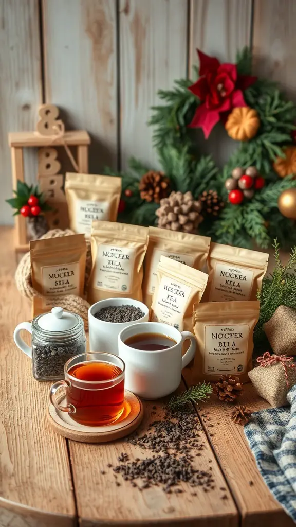 The image showcases a delightful collection of local tea blends, perfect for a cozy Christmas tea party. The warm wooden table sets the stage, adorned with festive decorations like pinecones and a wreath, creating a cheerful atmosphere.