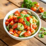 A refreshing and vibrant salad featuring crisp cucumbers, juicy tomatoes, and fresh herbs tossed in a light olive oil and vinegar dressing. This simple, quick-to-make dish brings summer freshness to your table with minimal effort. Perfect as a side or a light lunch, it’s naturally vegan, gluten-free, and packed with flavor.