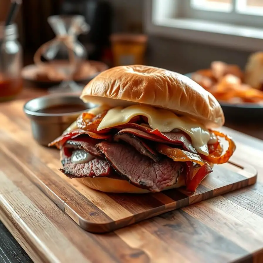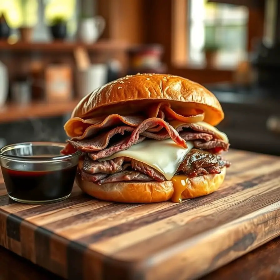 Indulge in the ultimate comfort food with this French Dip Sandwich recipe. Tender, juicy roast beef piled on toasted French rolls, melted cheese, caramelized onions, and served with rich, savory au jus for dipping. Perfect for cozy fall dinners or family gatherings.