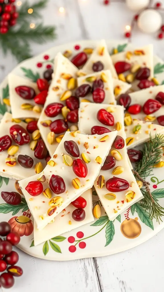 This delightful treat combines the sweetness of white chocolate with the tartness of cranberries and the crunch of pistachios. The vibrant colors make it a festive addition to any holiday spread.