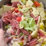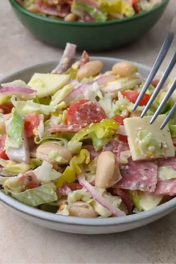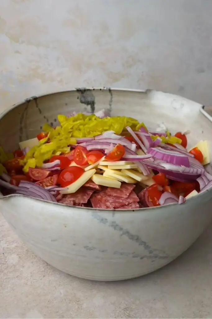 All the bold flavors of the classic Italian grinder sandwich—salami, ham, provolone, crisp lettuce, tangy peppers, and creamy dressing—turned into a hearty, refreshing salad. Perfect for dinner, potlucks, or weekday lunches.