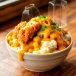 - Assemble bowl: mashed potatoes first, then gravy, corn, fried chicken, and cheese on top.