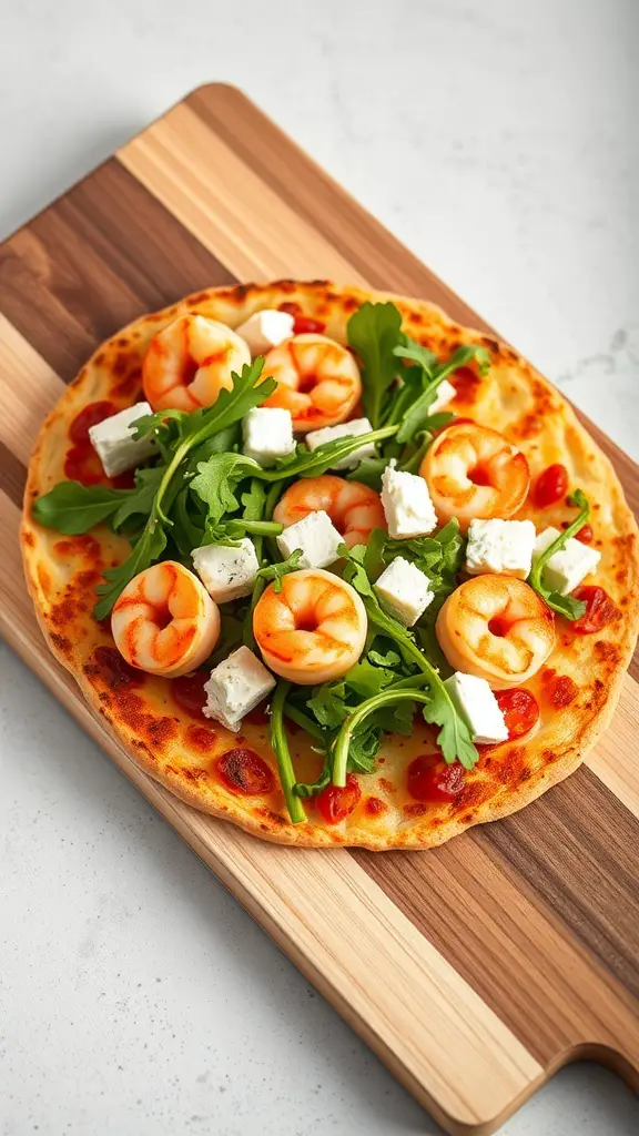 To make this dish, start with a flatbread base. Spread a layer of tomato sauce, then add the shrimp and feta. Bake until everything is warm and bubbly. Top with fresh arugula before serving for a pop of color and freshness.