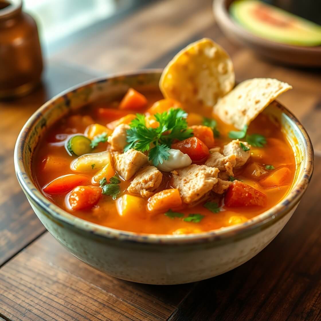 - Serve hot, garnished with cilantro, lime, and tortilla strips.