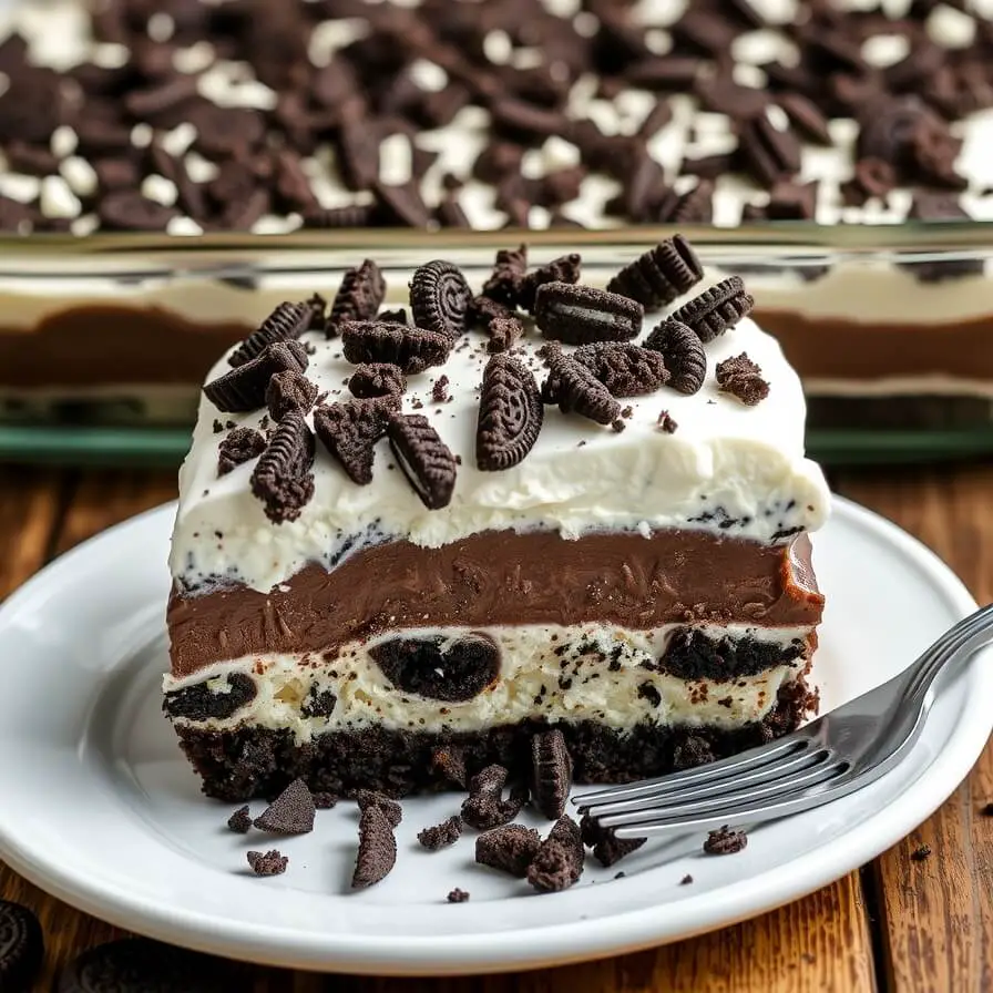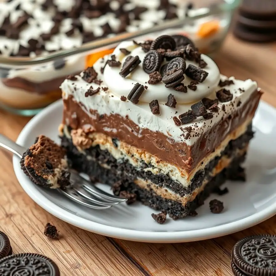 A no-bake layered dessert featuring a crunchy Oreo crust, creamy cheesecake filling, silky chocolate pudding, and a fluffy whipped topping. Perfect for gatherings, holidays, or whenever your sweet tooth calls.