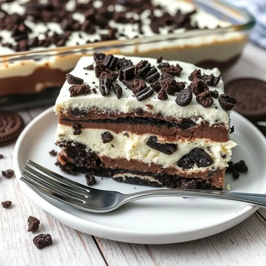 Oreo lasagna is already a showstopper when served straight from the pan, but presentation can take it from comforting to downright impressive. When I serve it for gatherings, I cut neat squares and place them on chilled dessert plates—this helps the layers hold their shape.