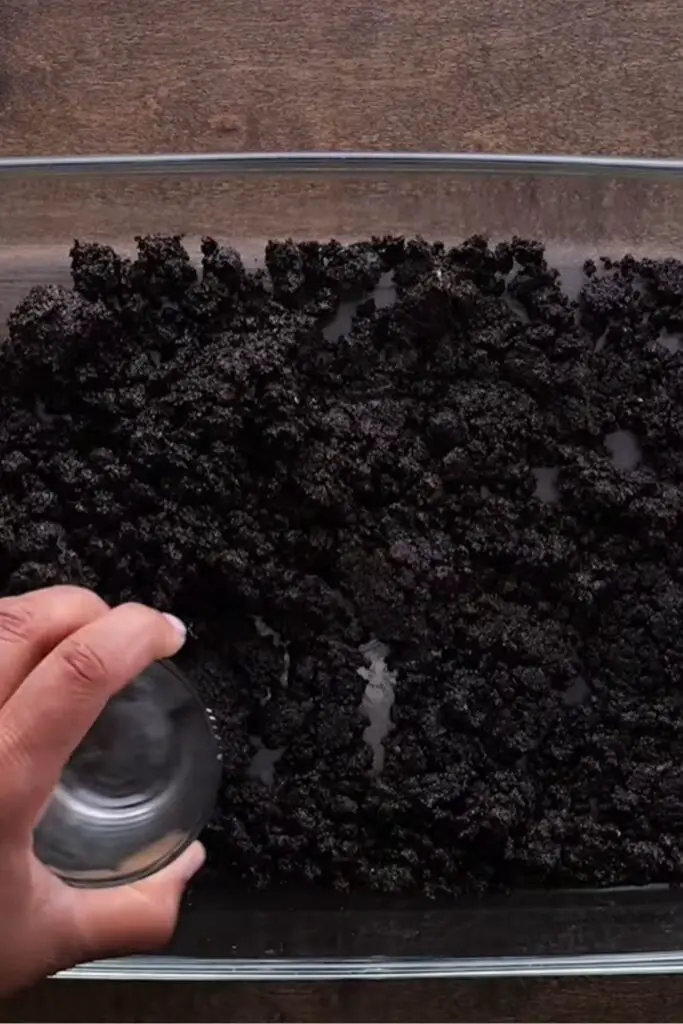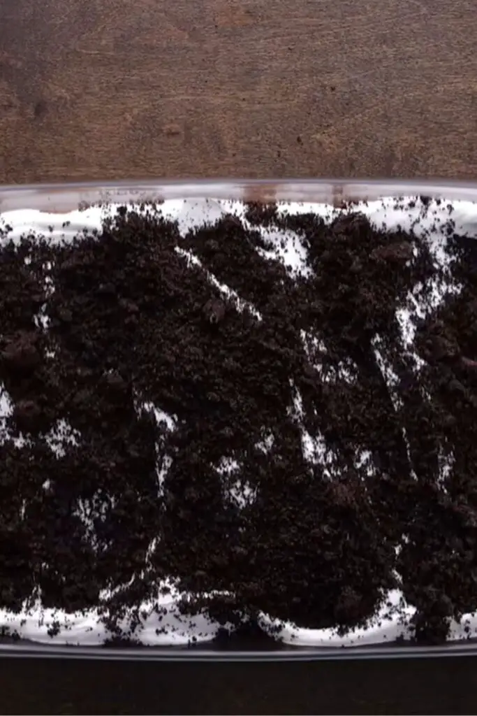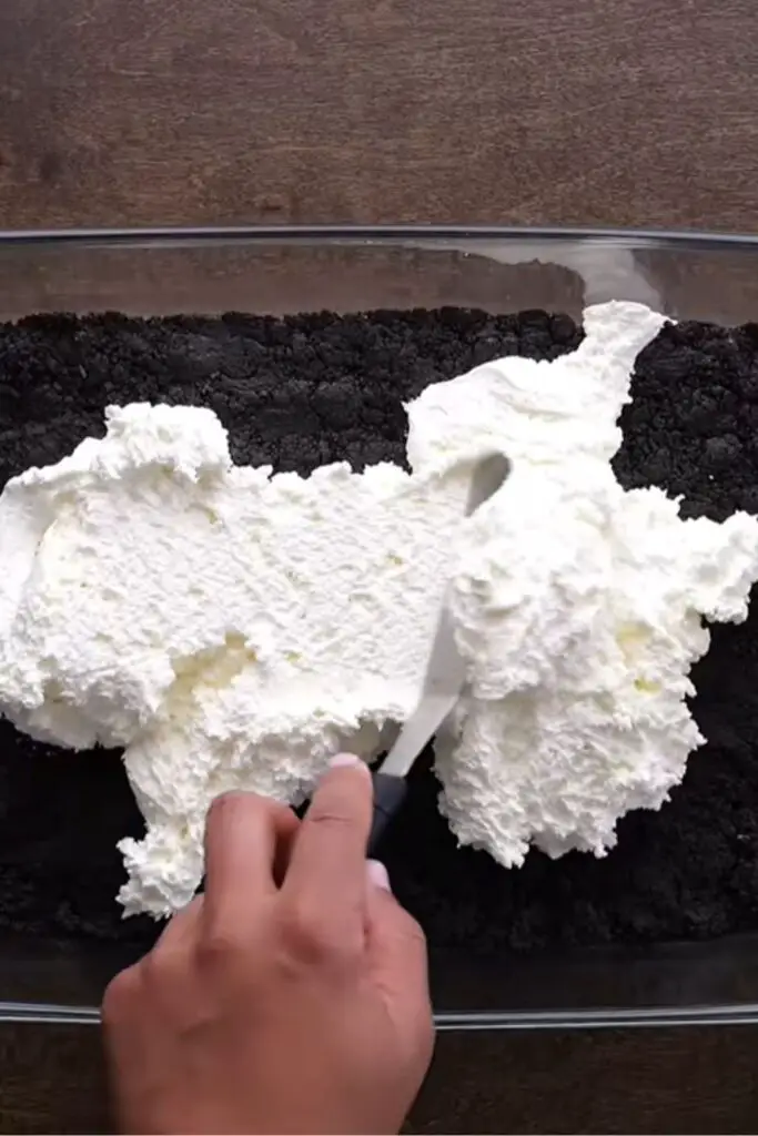 - Crush Oreos into fine crumbs. Mix with melted butter and press into a 9×13-inch dish. Chill.
