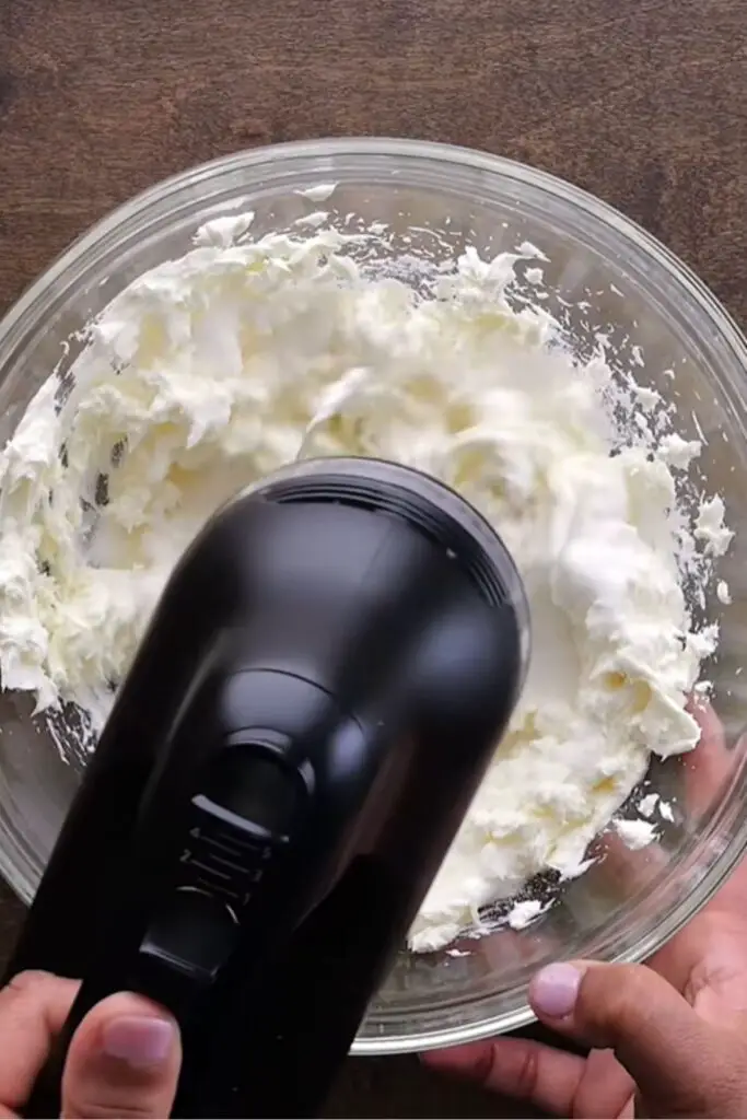 - Beat softened cream cheese until smooth. Add powdered sugar and half of the whipped topping.