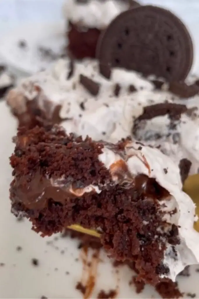 There’s something so satisfying about slicing into an Oreo poke cake. The first forkful always draws an audible “mmm” from anyone nearby. I like to serve mine straight from the fridge, cold and creamy, with each slice holding the perfect balance of cake, pudding, and whipped topping.