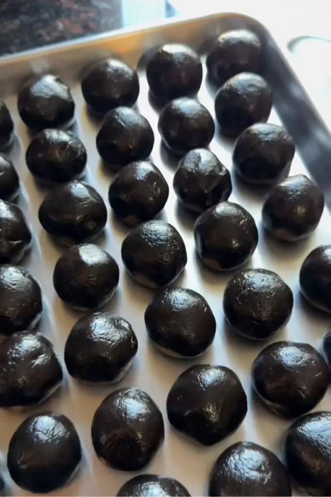 Scoop small portions of the mixture (about 1 tablespoon each) and roll them into balls. Place them on a parchment-lined baking sheet. Don’t worry if they’re not perfectly round—chilling will firm them up, and a chocolate coating hides all imperfections.