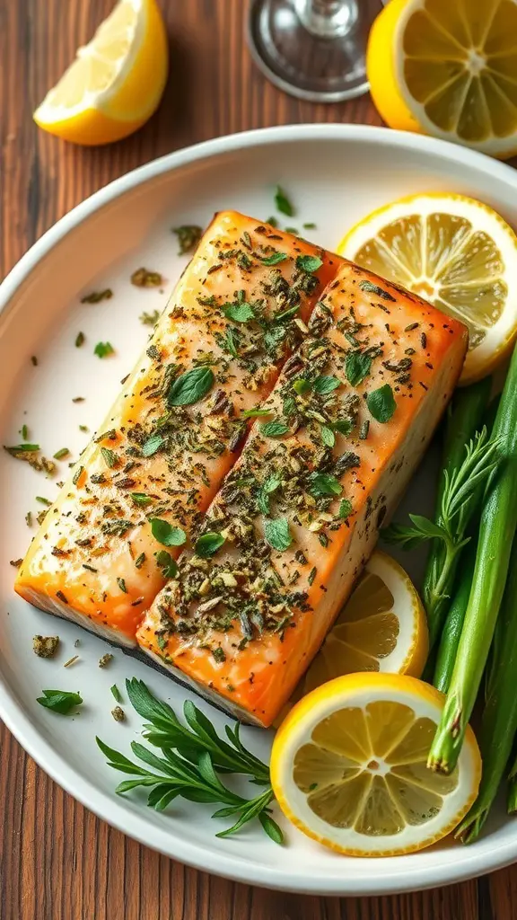 This Lemon Herb Crusted Salmon is a delightful dish that combines fresh flavors and a simple preparation. The image showcases a beautifully cooked salmon fillet, topped with a mix of herbs that add a burst of taste. The vibrant colors of the herbs and lemon slices make it visually appealing, inviting you to dig in.