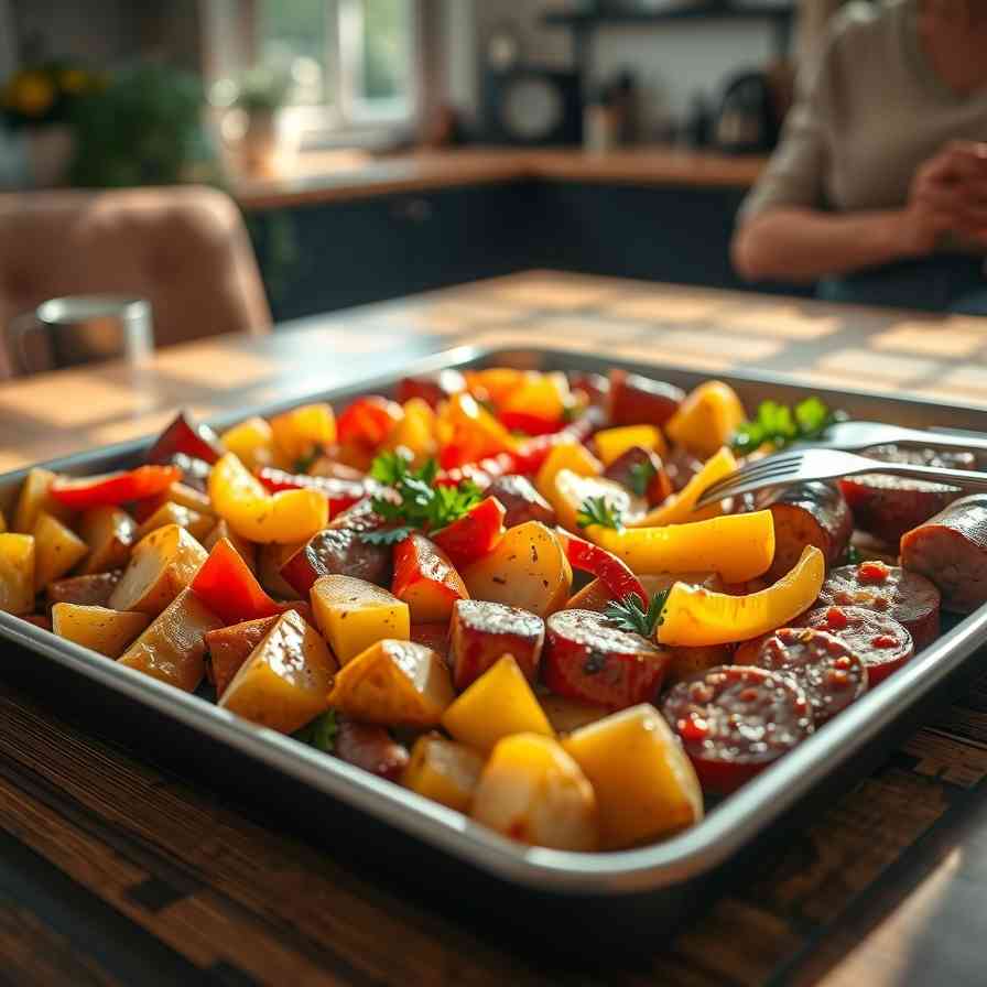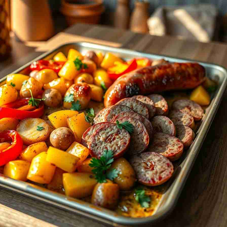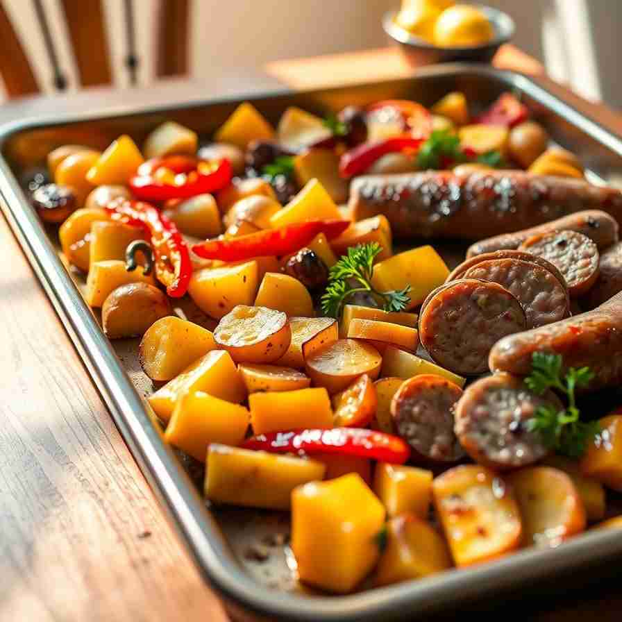 This sheet-pan meal combines smoky sausage, tender roasted potatoes, and sweet, caramelized peppers for a hearty, comforting dinner. Minimal prep, flexible ingredients, and bold flavor make it perfect for weeknights, meal prep, or casual entertaining.