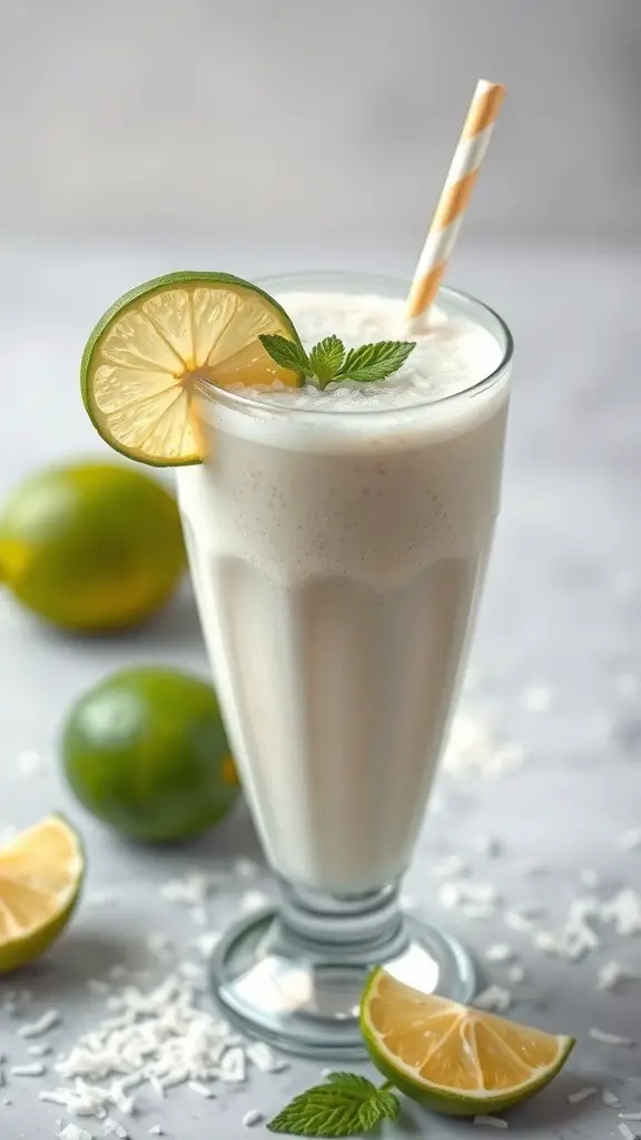 To make this smoothie, you’ll need coconut milk, fresh lime juice, and a bit of sweetener. Blend these ingredients together until smooth. Serve it in a tall glass, garnished with a slice of lime and a sprig of mint for that extra pop of color.