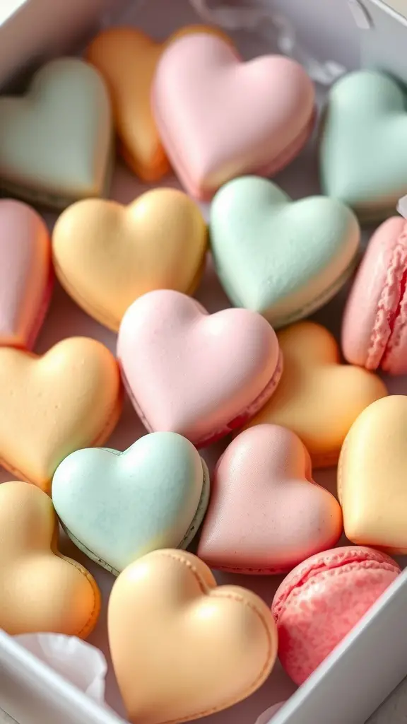 Heart-shaped macarons are a delightful treat perfect for Valentine’s Day. Their charming shape and vibrant colors make them a lovely addition to any sweet box. These macarons come in various pastel shades, including pink, mint green, and soft yellow, creating a visually appealing display.