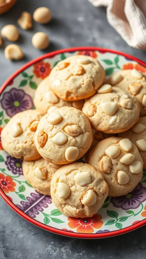 These classic white chocolate macadamia nut cookies are a delightful treat. The image shows a plate of golden cookies, each studded with creamy white chocolate chips. The cookies look soft and inviting, perfect for any occasion.